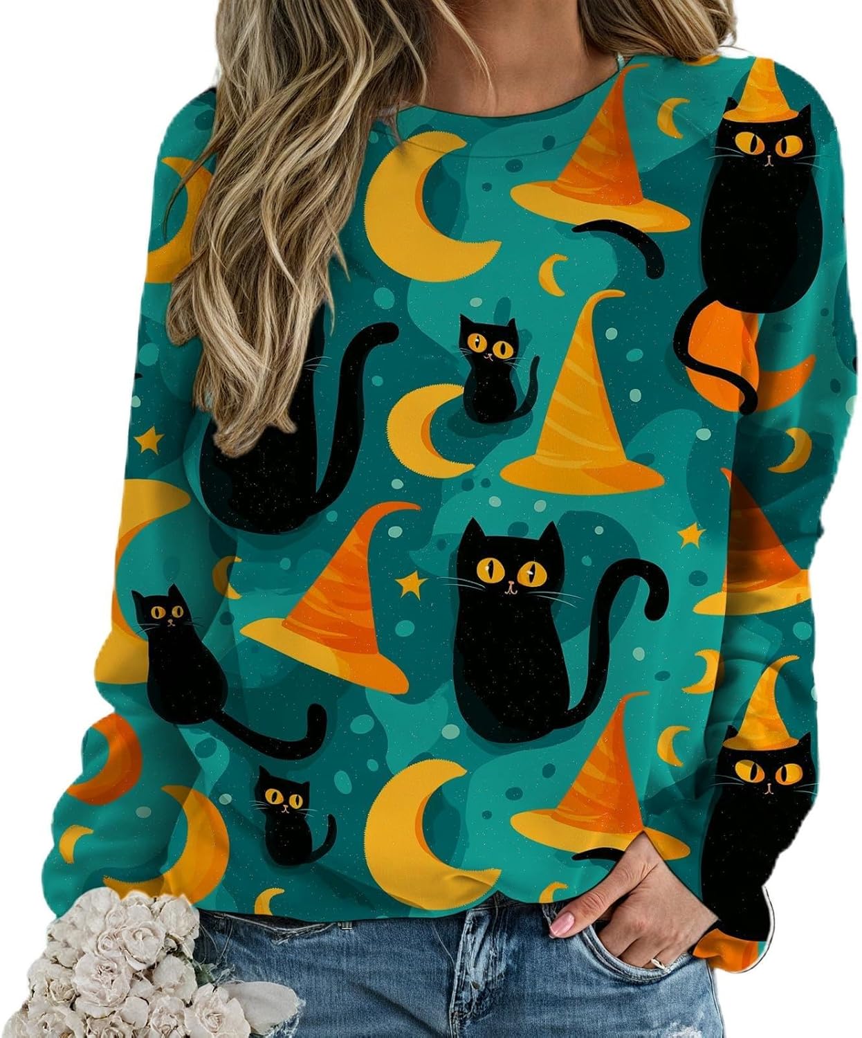 Novelty Halloween Shirts for Women Trendy Graphic Print Long Sleeve Crewneck Fall Tops Loose Casual Pullover