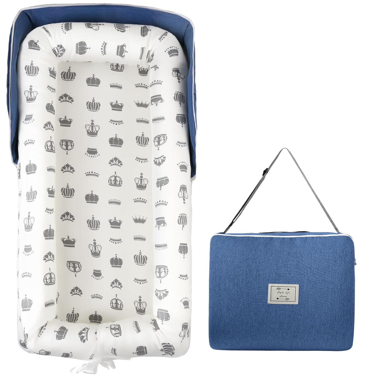 Portable Baby Lounger - Foldable Infant Lounge with Adjustable U-Shaped Bumper & Storage Bag, Breathable Cotton Snug Spot for Supervised Rest & Play at Home or On The Go,Blue Crown