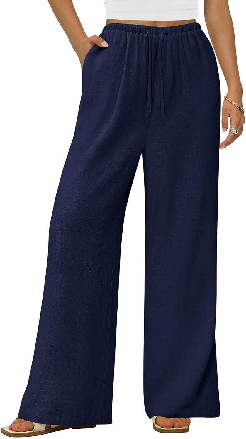 PRETTYGARDEN Summer Wide Leg Linen Pants Women with Pockets High Waist Drawstring Loose Casual Palazzo Lounge Pants Women