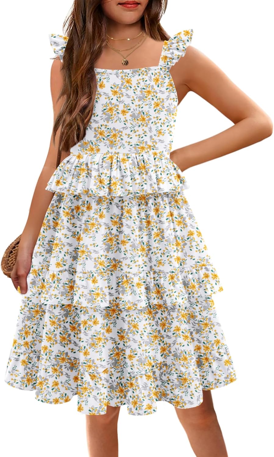 Arshiner Girls Dresses Ruffle Sleeve Tiered Casual Flowy Swing Tween Sundress with Pockets for Girls 5-13 Years