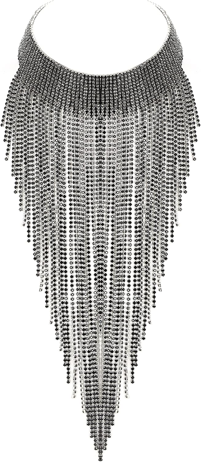 Flyonce Rhinestone Statement Necklace for Women, Tassel Bib Choker Collar Chunky Costume Jewelry for Party Formal