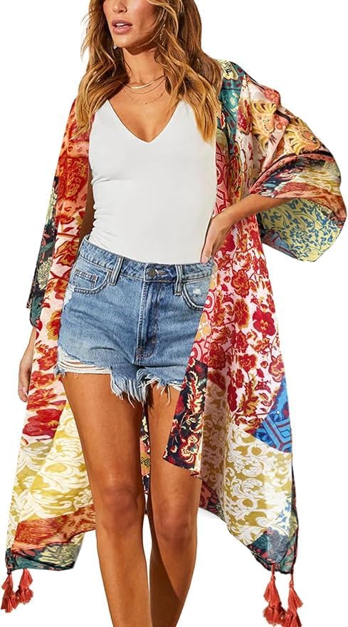 Moss Rose Women's Beach Cover up Swimsuit Kimono with Bohemian Floral Print, Loose Casual Resort Wear