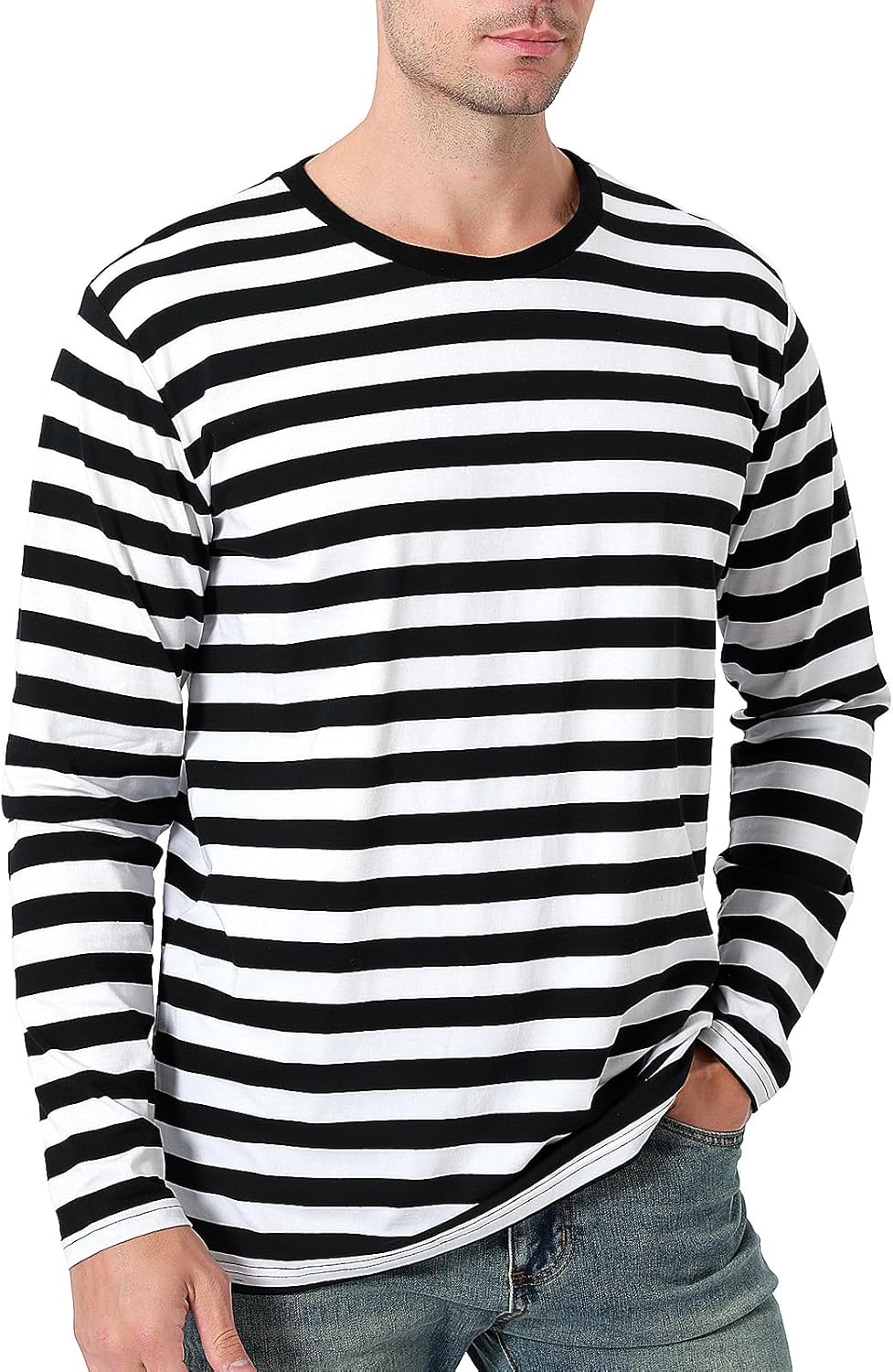 Funny World Men's Striped Cotton Long Sleeve T-Shirts Casual Crewneck Basic Tee