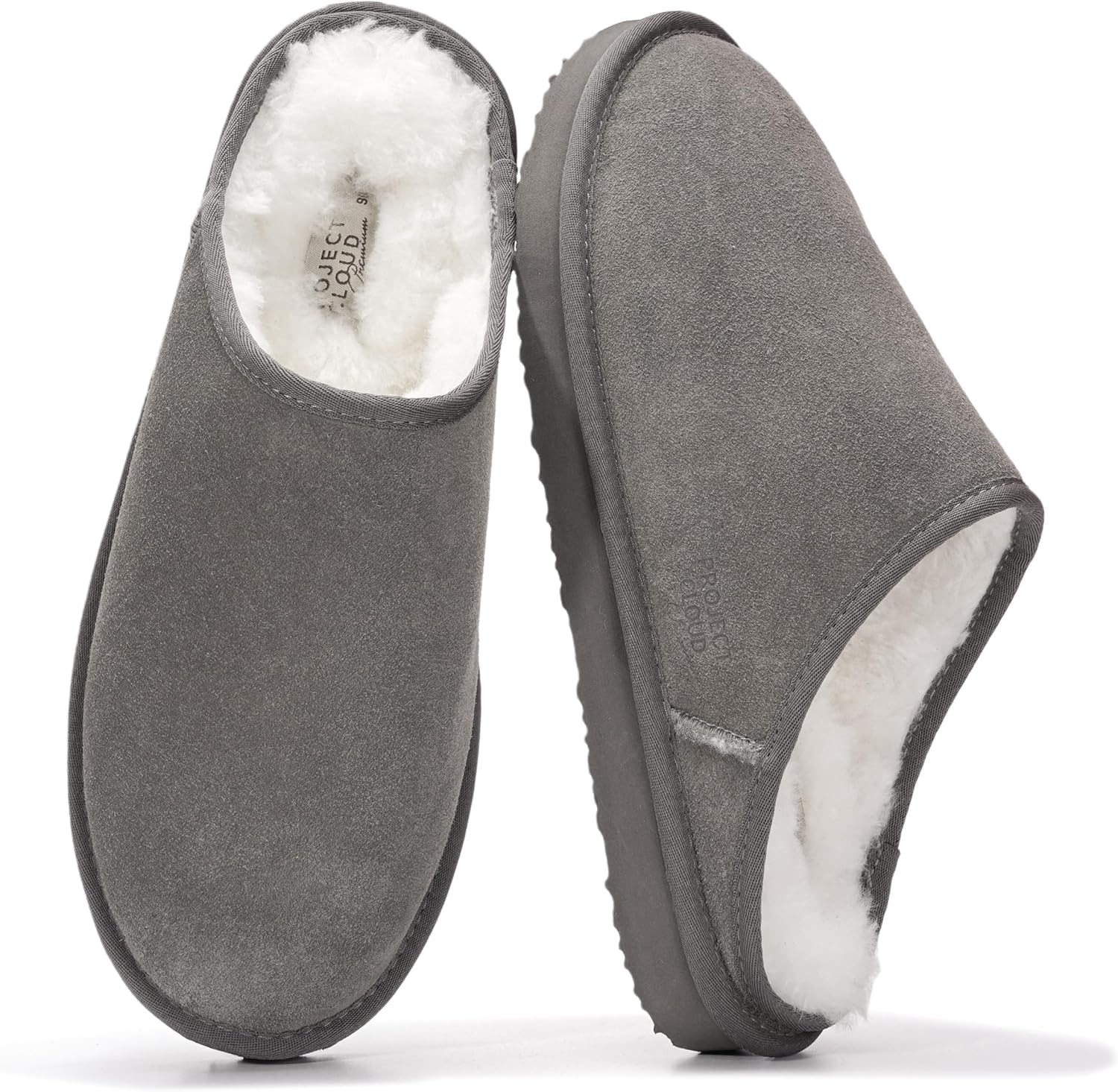 Project Cloud Mens Slippers 100% Genuine Leather and Genuine Shearling Lining – House Slippers for Men with Memory Foam Insole – Lightweight & Non Slip Mens House Shoes