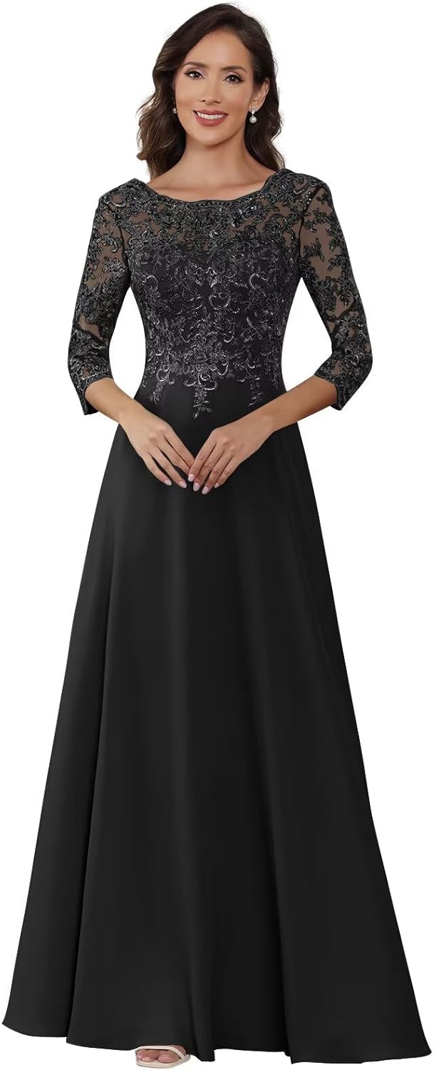 Mother of The Bride Dresses -Long Chiffon Lace Appliques with 3/4 Sleeve Scoop Neck Foraml Evening Gown