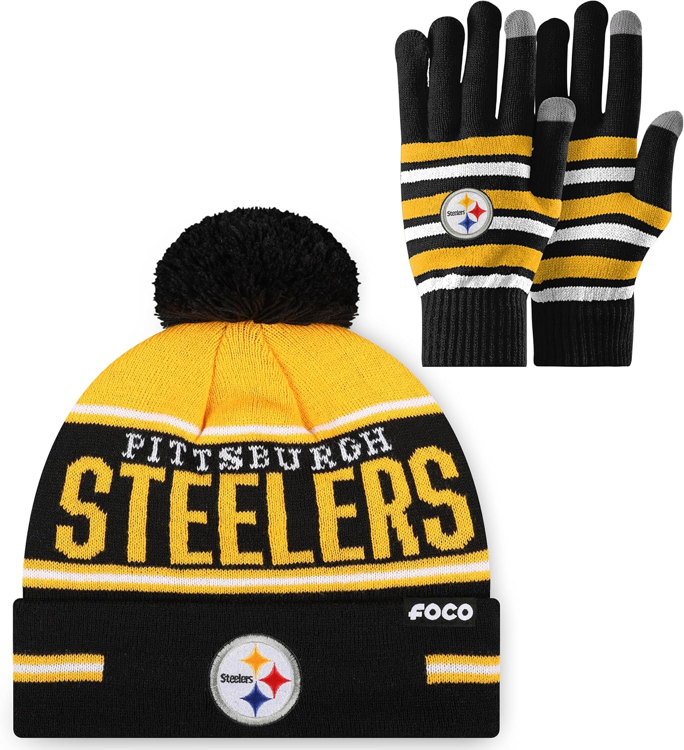 FOCO NFL unisex-adult Nfl Team Logo Adult Stretch Gloves With Big Wordmark Strip Pom Knit Hat Beanie Set