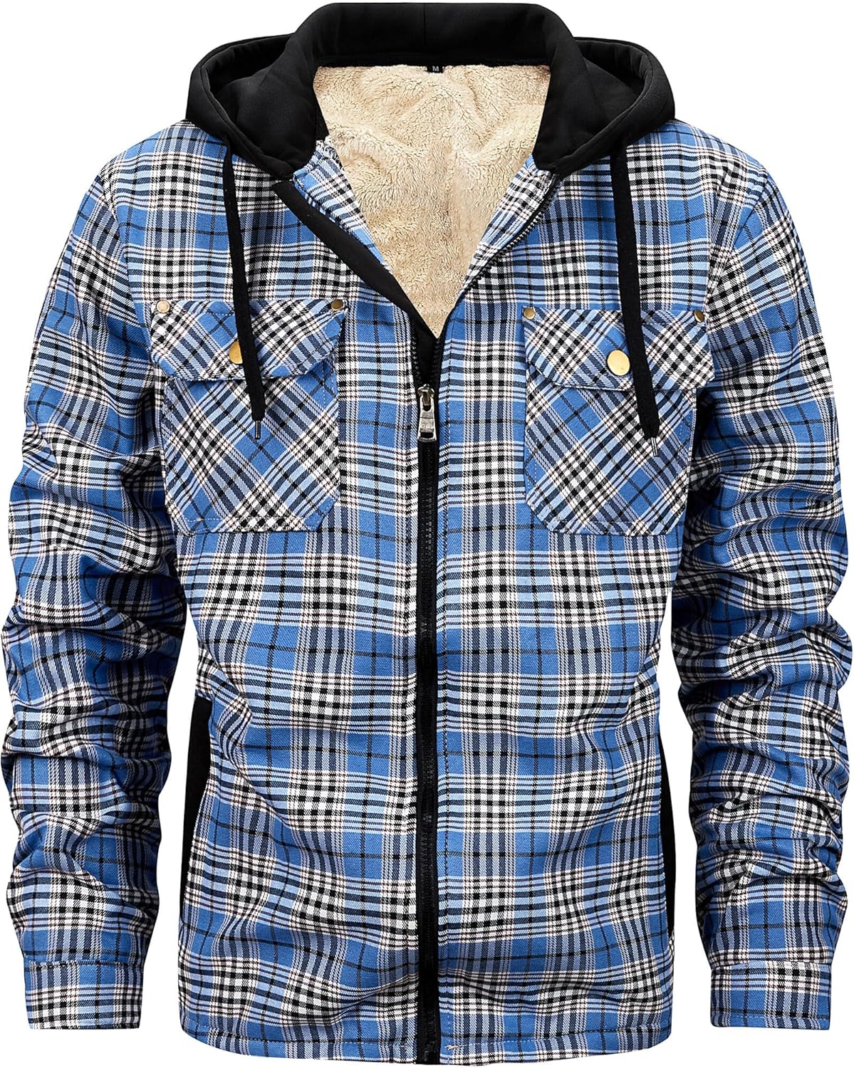 Men's Winter Fleece Warm Thick Plaid Jackets Heavyweight Cotton Hoodies Flannel Hooded Shirt Jacket