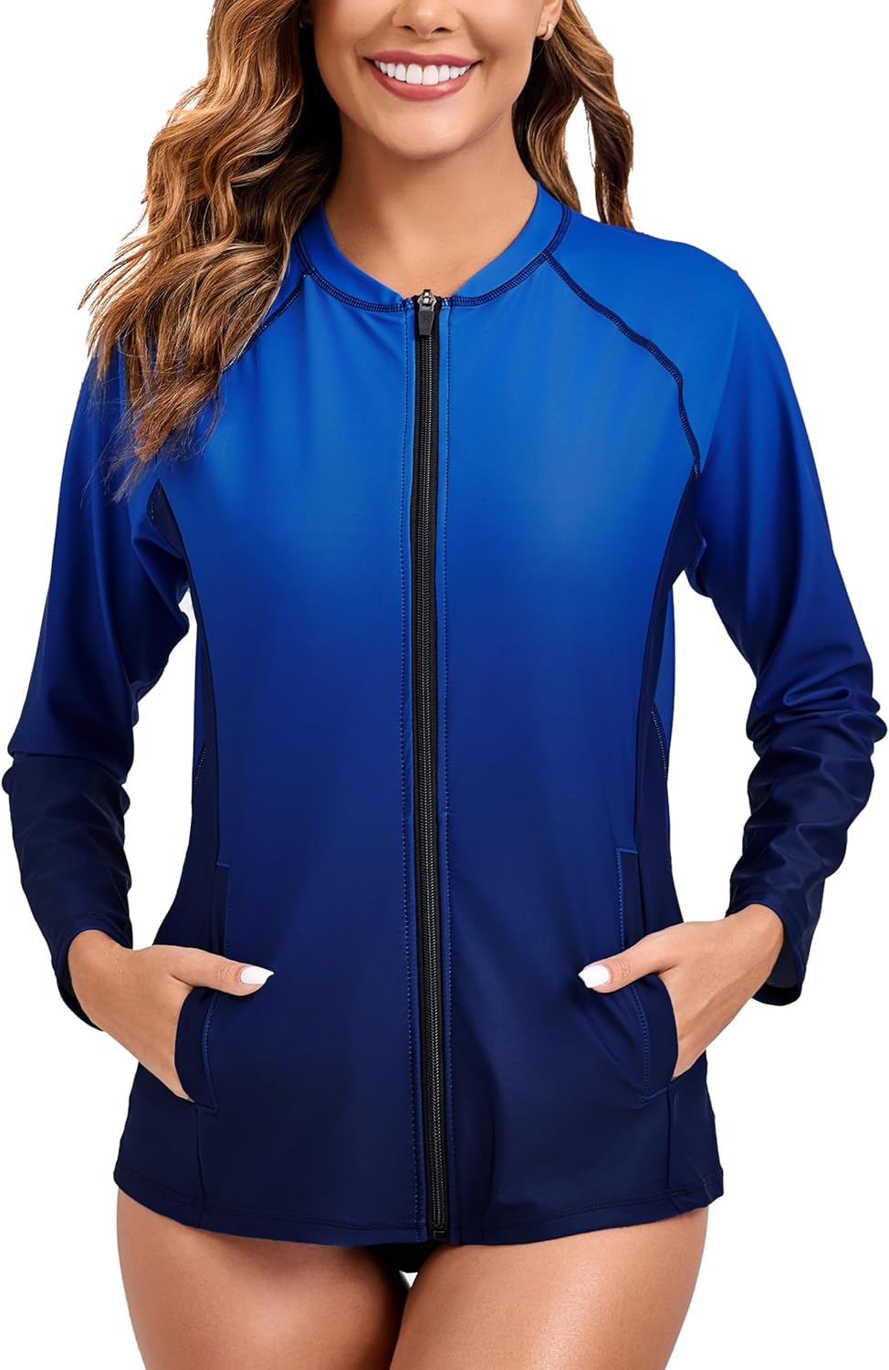 Halcurt Women's Full Zip Long Sleeve Rash Guard Swim Top with Pockets UPF50+ Quick Dry Swimsuit