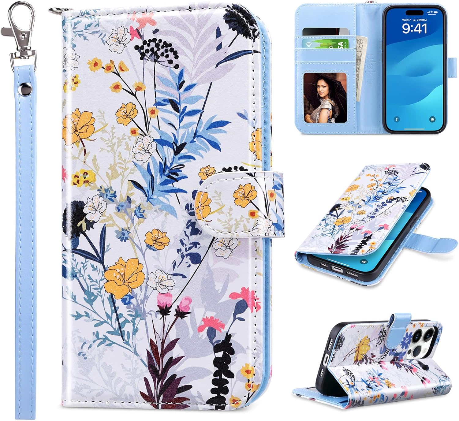 ULAK Compatible with iPhone 15 Pro Wallet Case with Card Holder, Flower Flip Case Wallet for Women Girls PU Leather Kickstand Wrist Strap Shockproof Phone Cover for iPhone 15 Pro 6.1", Forest
