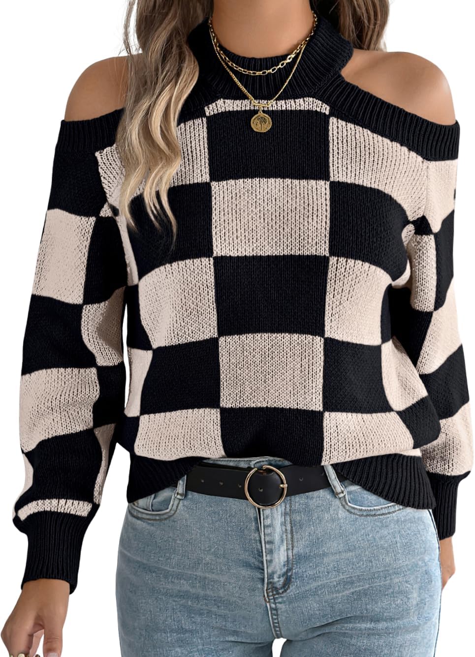 2000s Women Cold Shoulder Sweaters, Color Block Checkered Knit Sweater, Crewneck Long Sleeve Jumper Tops Fall Outfits