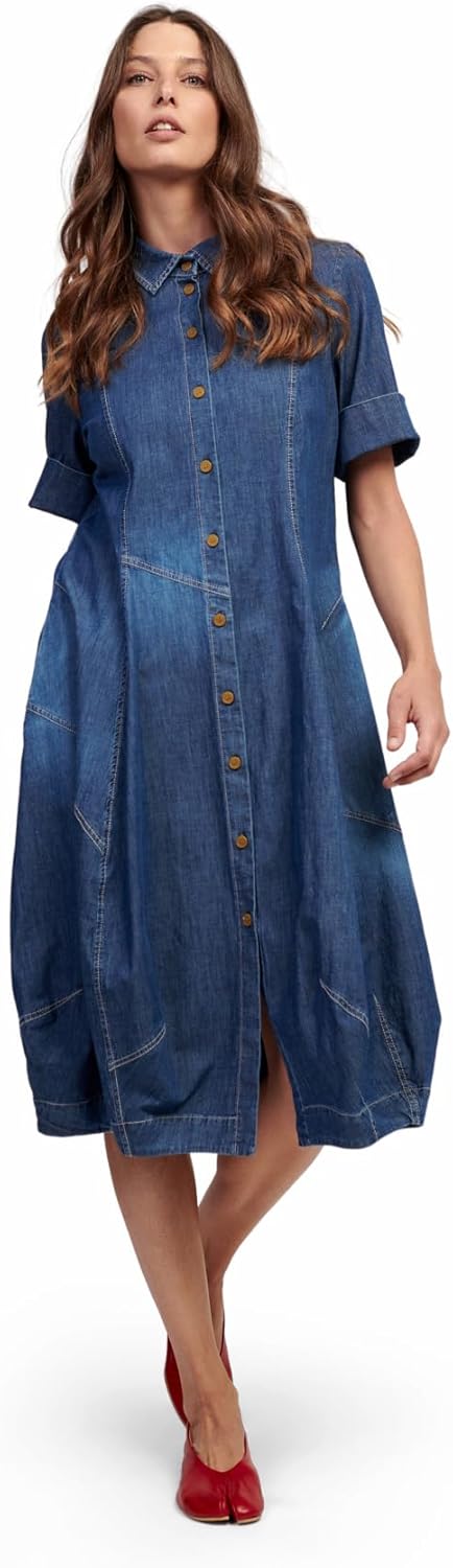 ALEMBIKA Barb Denim Shirt Dress - Midi-Length Denim Dress with Full Button Placket - Luxury Shirtdresses for Women