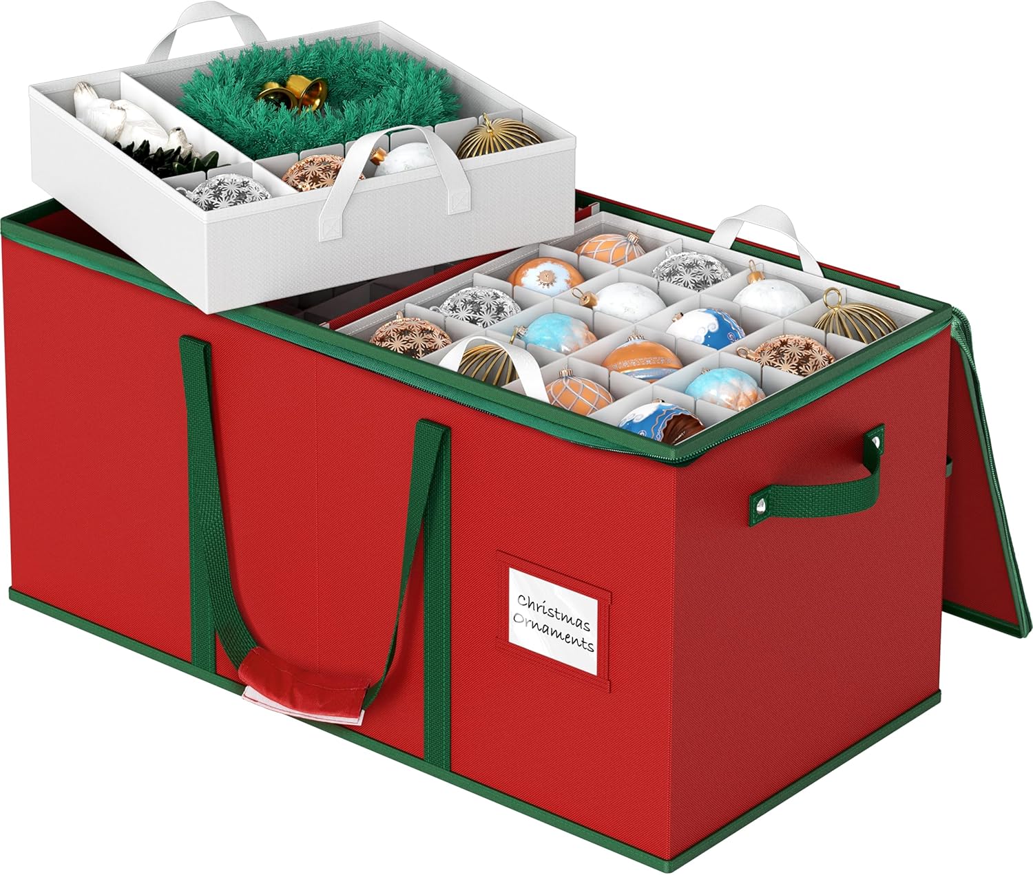 Simple Houseware Heavy-Duty Large Christmas Ornament Storage Box with Adjustable Dividers, Stores up to 128 Ornaments, Zipper Lid, Red