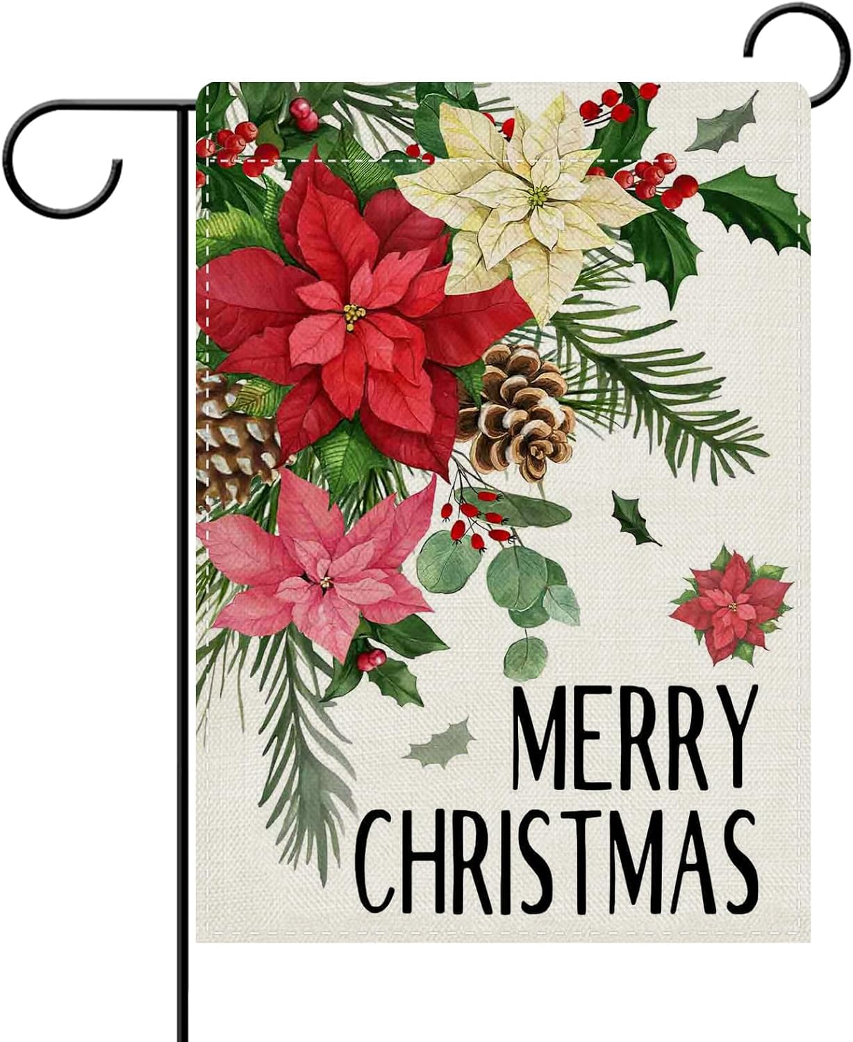 Dyrenson Merry Christmas Poinsettia Flower Decorative Garden Flag, Xmas Floral Pine Cone Holly Red Berries Yard Outside Home Decoration, Winter Holiday Burlap Outdoor Small Decor Double Sided 12 x 18