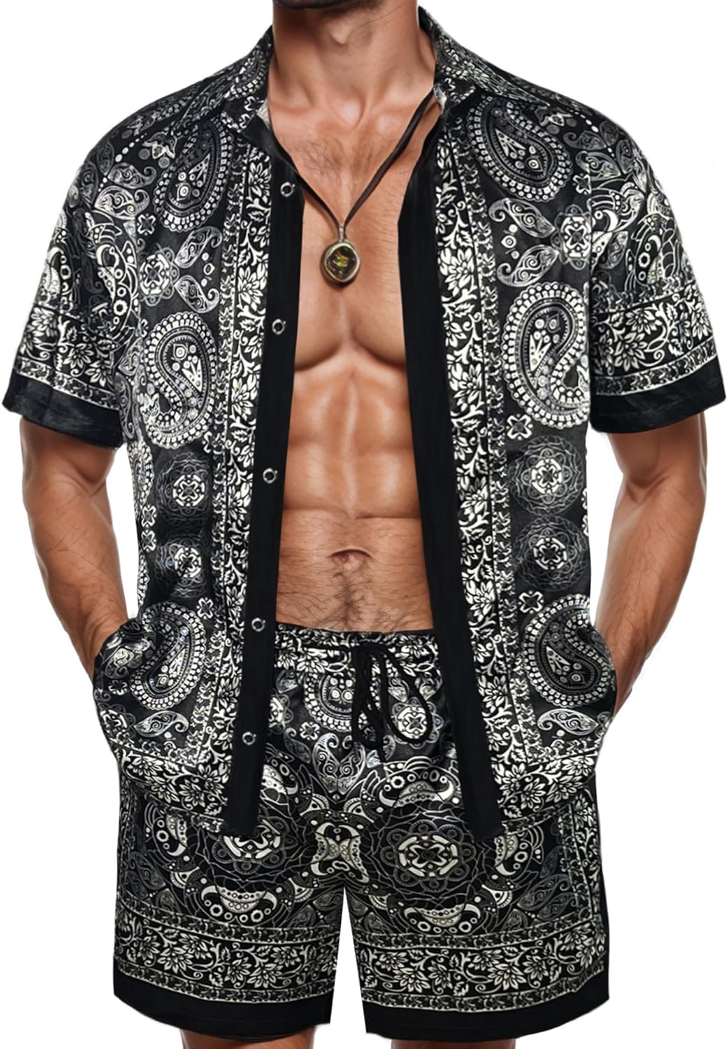 Mens Hawaiian Shirt Sets Satin Silk Casual Button Down Shirts 2 Piece Luxury Summer Beach Outfits for Men