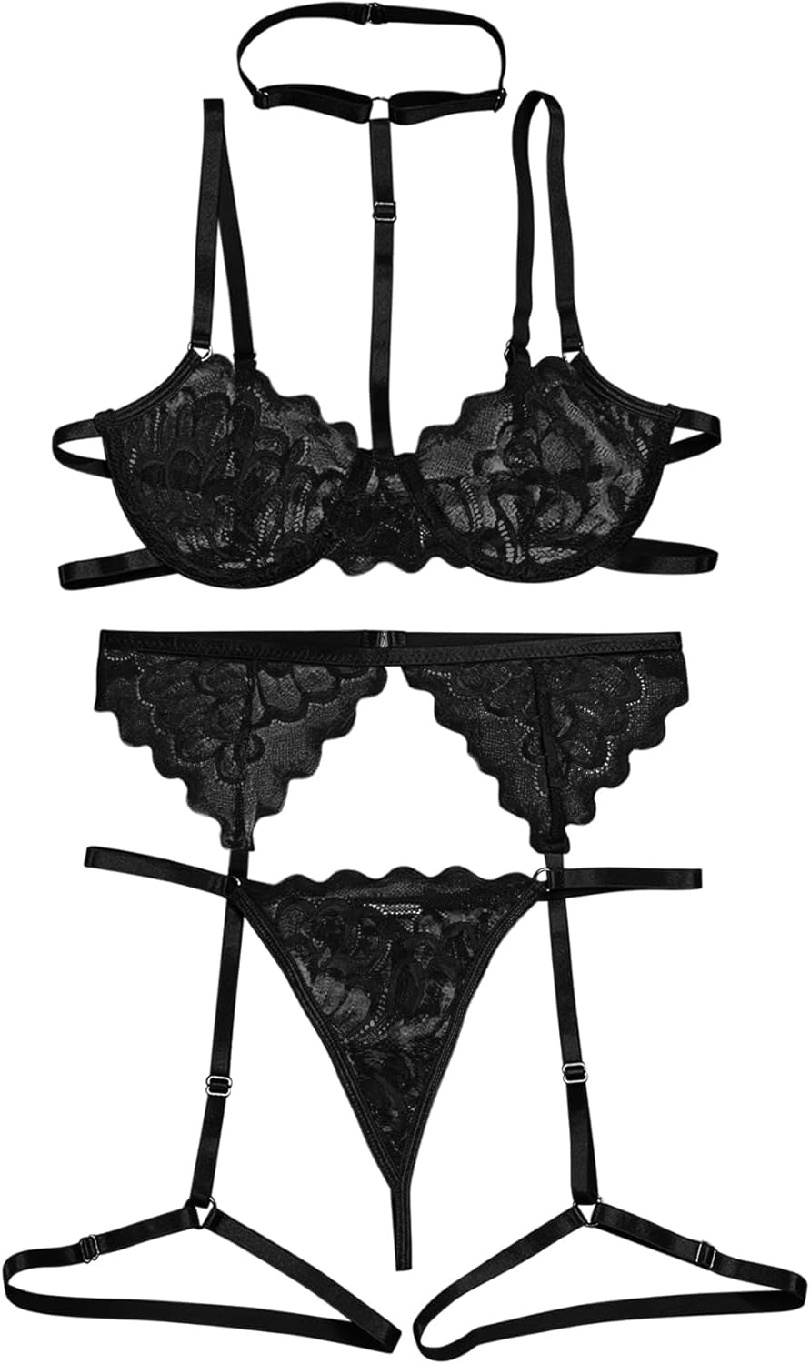 Sexy Choker Scallop Underwire Floral Lace Sheer Garter Belt Lingerie Set 3 Piece