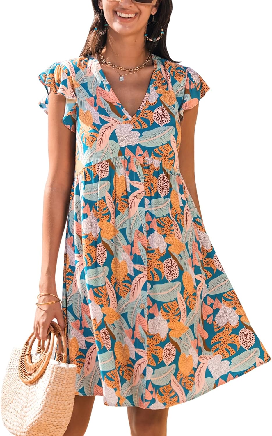 CUPSHE Women's Ruffle Floral Summer Dress 2025 V Neck Flutter Sleeve Smocked Casual Sundress Holiday Beach Mini Dress