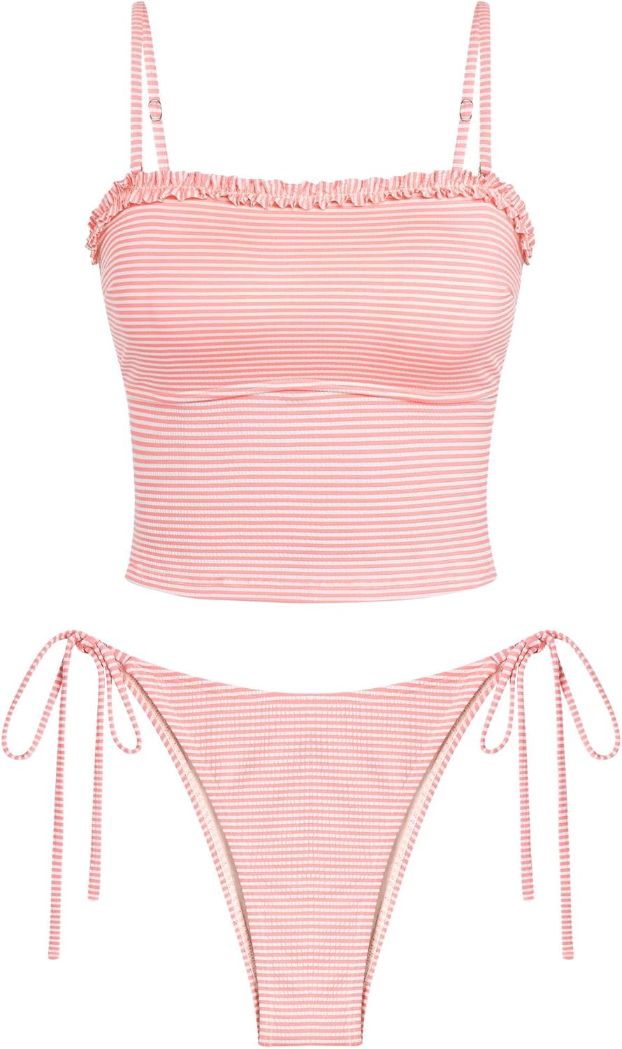 ZAFUL Women's Tankini Swimsuits Ruffles High Cut Swimwear Striped Tie Back Knot Two Piece Cheeky Bathing Suit