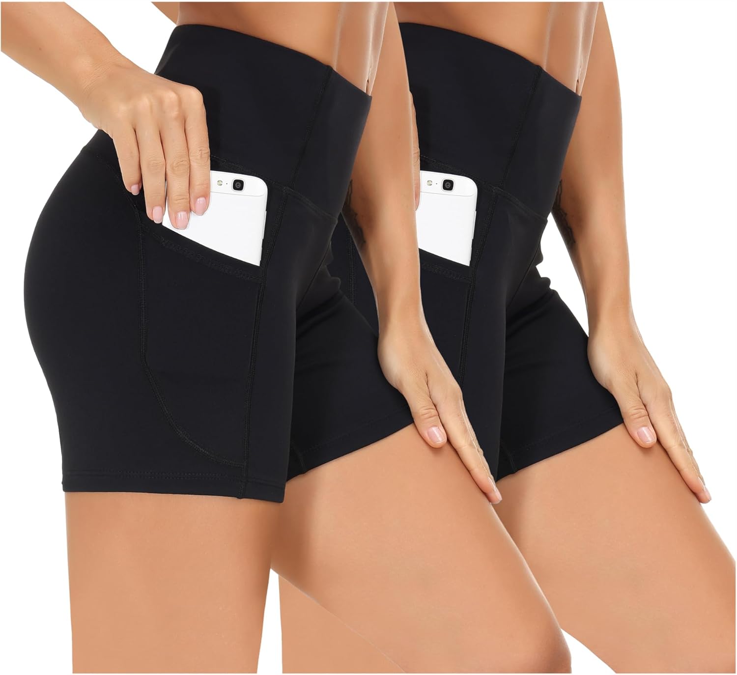 THE GYM PEOPLE 2 Pack Women's High Waist Workout Shorts with Deep Pockets Tummy Control Running Yoga Shorts