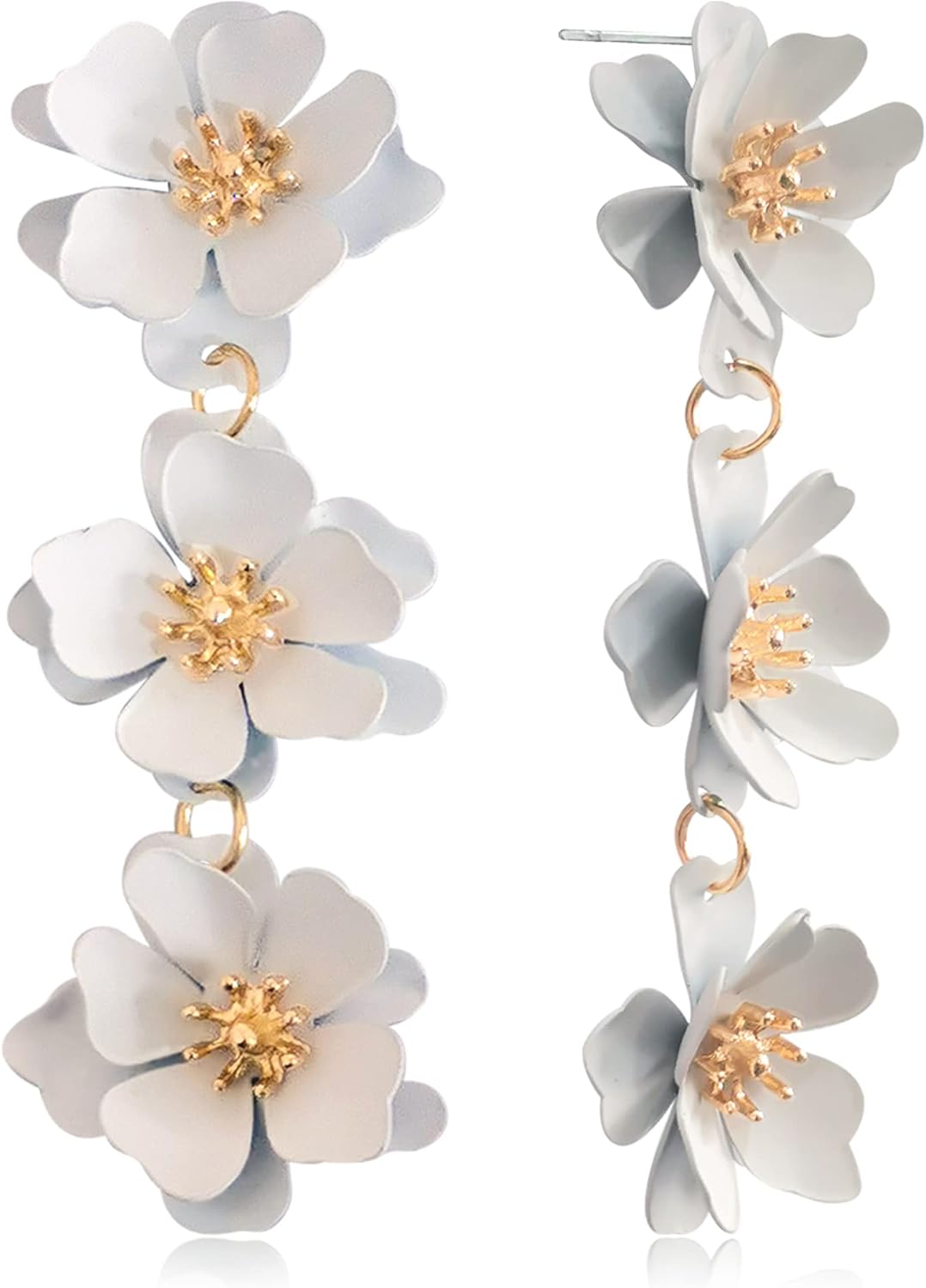 Elegant Bohemian Matte Tiered Triple Flower Dangle Drop Earrings Chic Charm Cute Long Floral Stud Earrings for Women Statement Jewelry Gifts