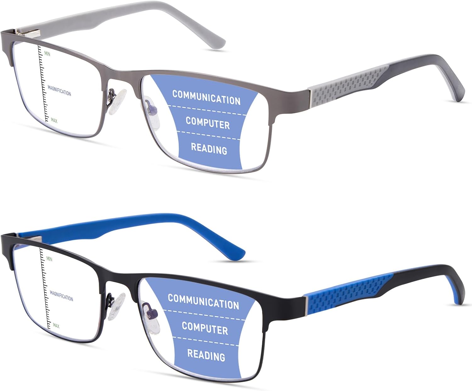 - 【Stylish Rectangular Design for Modern Men】Features a sleek rectangular metal frame with semi-rimless construction for a minimalist yet professional look. The two-tone black/grey and black/blue silicone temples add a touch of contemporary style, making these progressive readers for men both functional and fashionable.