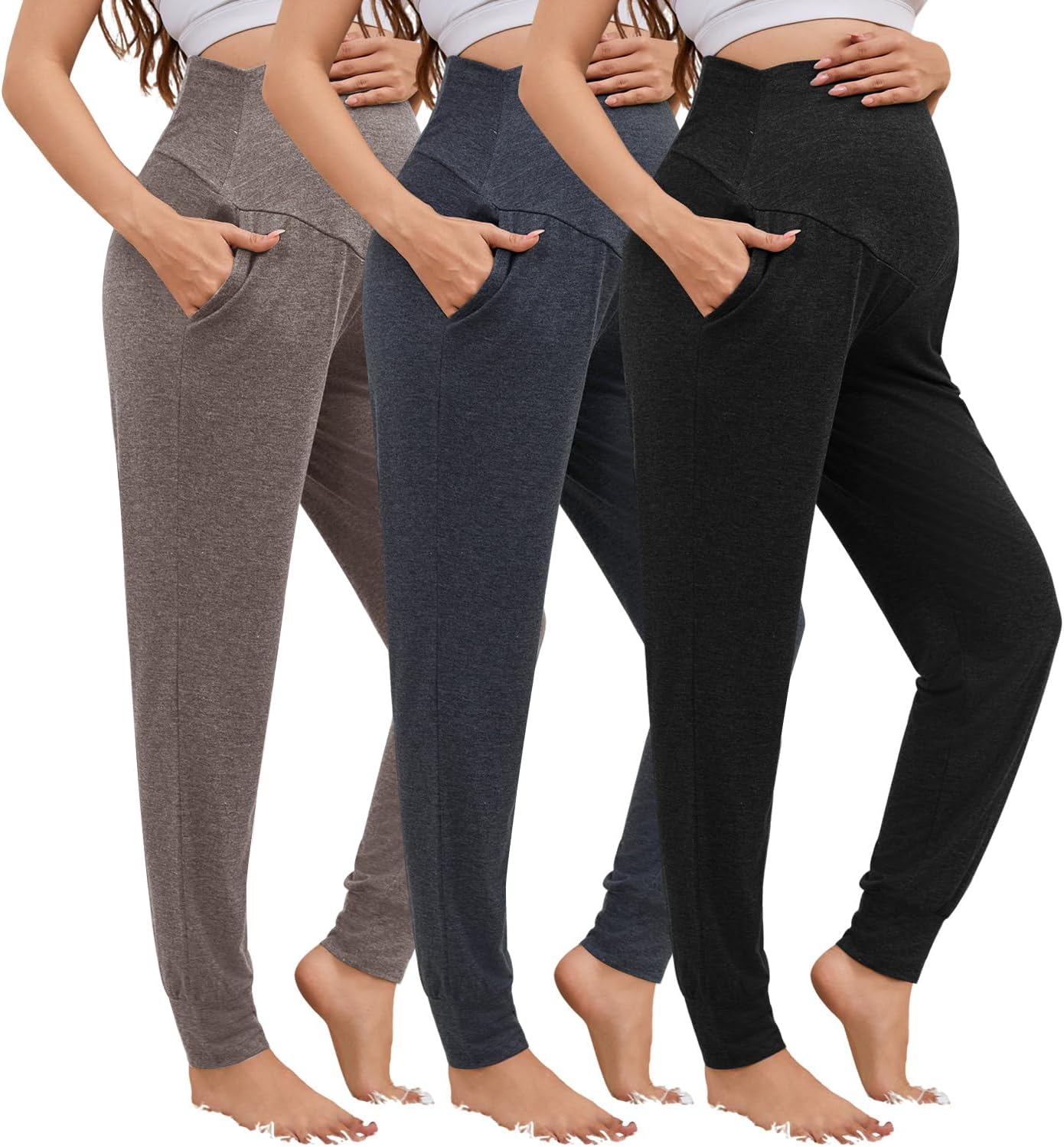 3 Pack Women's Maternity Sweatpants Over The Belly Pregnancy Jogger Pants Stretchy Maternity Pants with Pockets