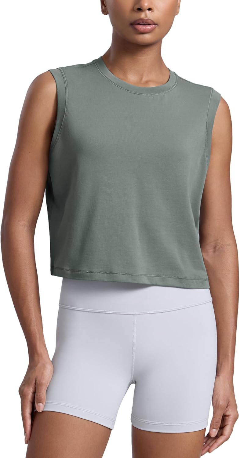 CRZ YOGA Cotton-Blend Workout Muscle Tank for Women Breathable Quick Dry High Neck Athletic Tops Casual Sleeveless Shirts