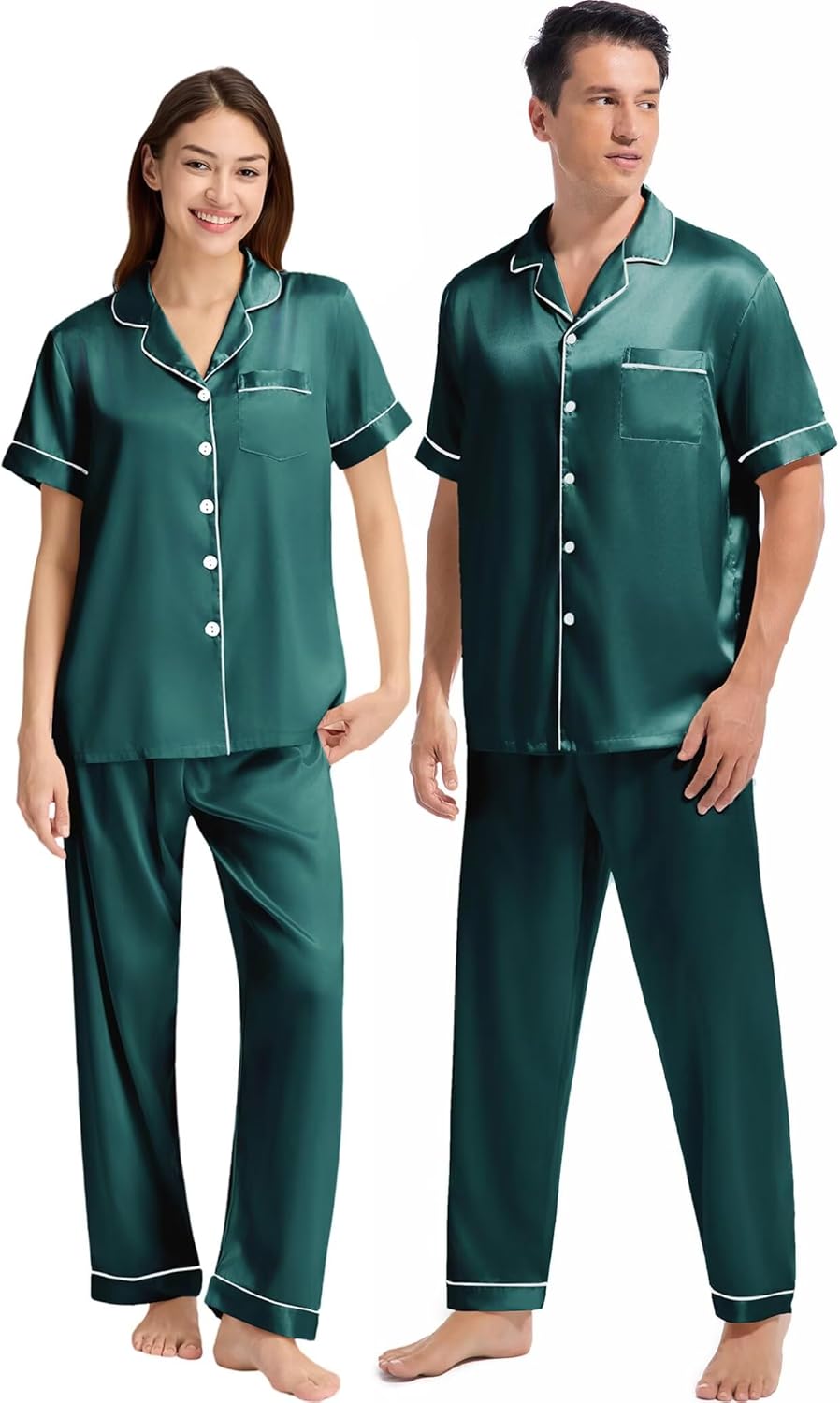 Couples Matching Pajamas Set Silk Satin Short Sleeve Button Down Loungewear with Long Pant