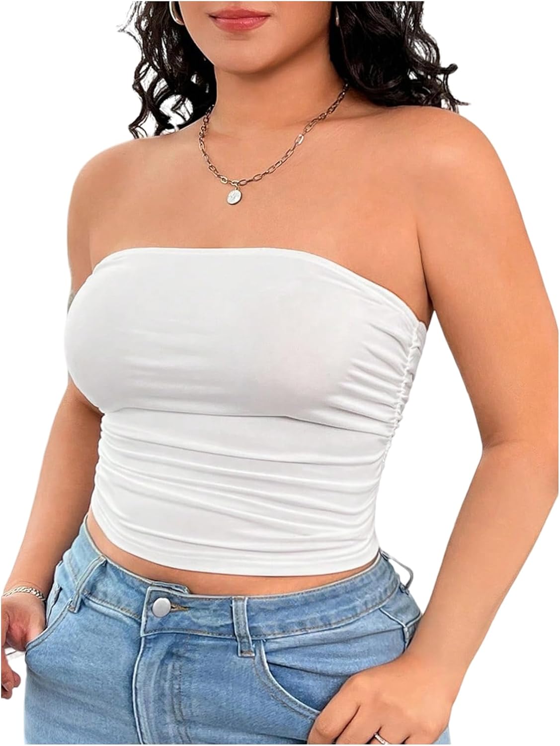 WDIRARA Women's Plus Size Strapless Ruched Crop Tube Tops Summer Slim Fit Sleeveless Bandeau Top
