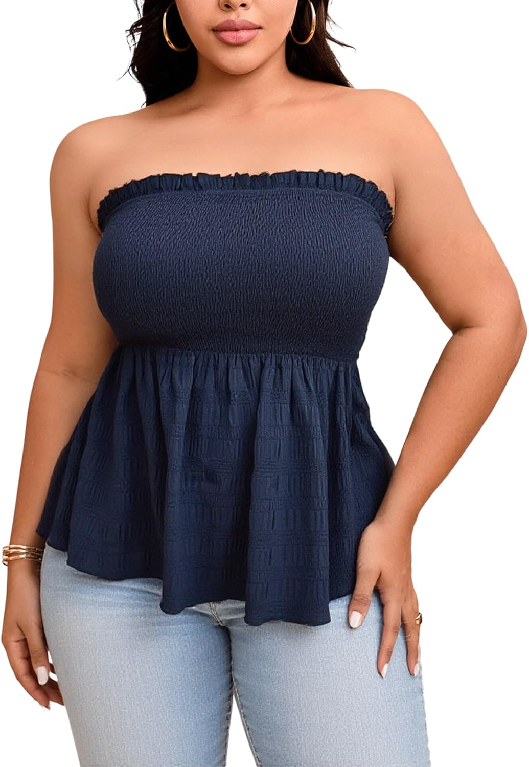 Women's Plus Size Peplum Tube Top Summer Strapless Shirred Flowy Cute Vacation Tops