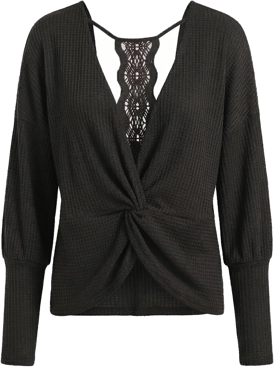 CUPSHE Womens Long Sleeve Crewneck Blouse Sexy Back Lace Ribbed Knit Tops