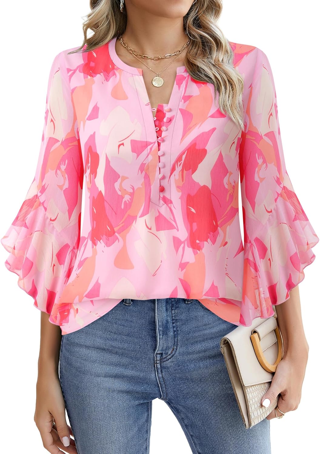 Timeson 3/4 Length Sleeve Womens Tops Dressy Casual Button Down V Neck Business Work Blouses