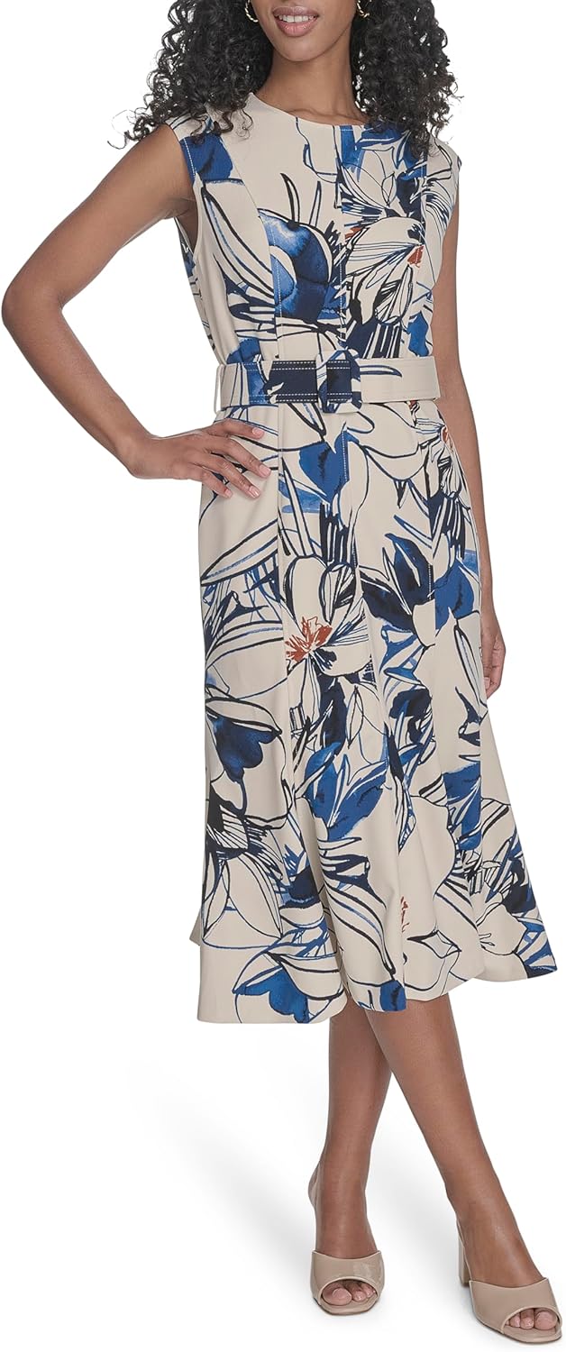 Calvin Klein Womens Sleeveless Belted A-line Flounce Midi Dress