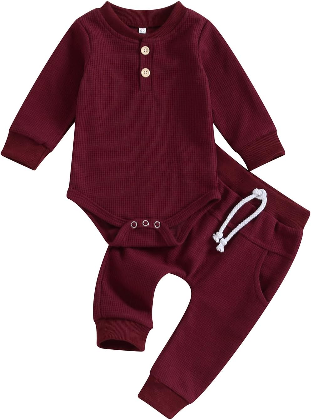 Kuriozud Newborn Baby Boy Clothes Button Long Sleeve Romper Bodysuit Pants Set Infant Soft Waffle Fall Winter Outfit