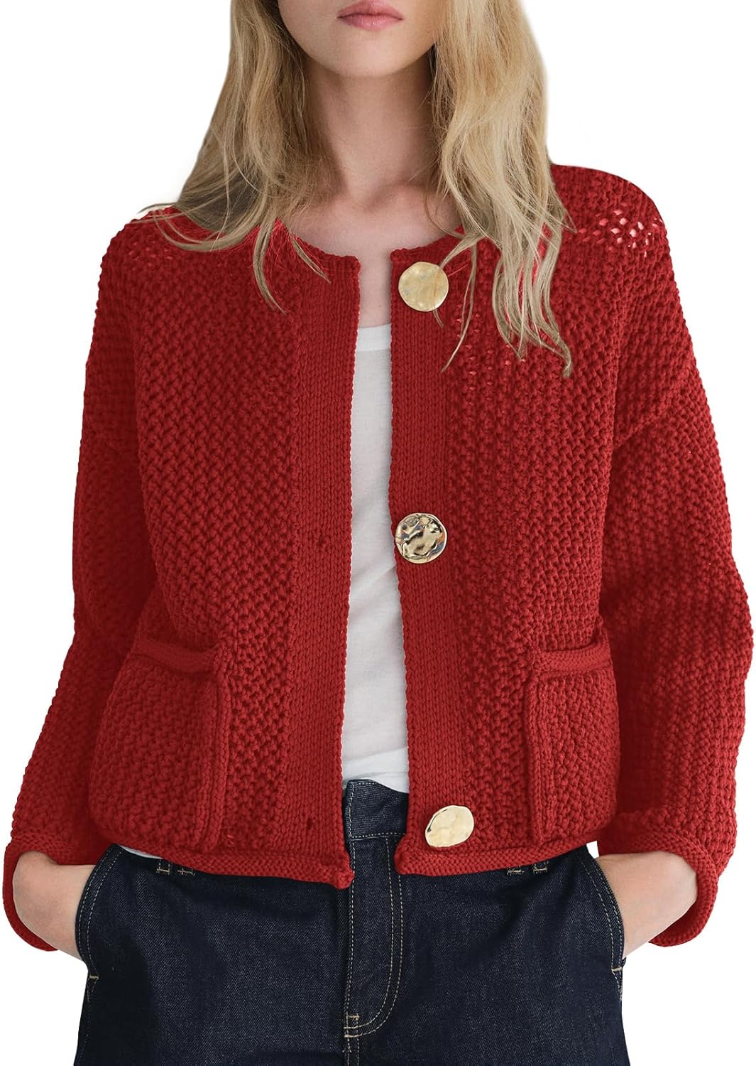 Balimtoy Womens Chunky Cropped Cardigan Long Sleeve Open Front Button Down Loose Cardigan Fall Outerwear with Pockets