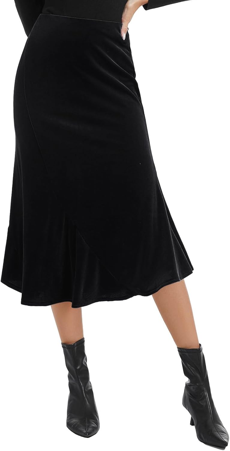 Women's Elegant Velvet Midi Skirt High Waist Asymmetric Flared Mermaid Hem