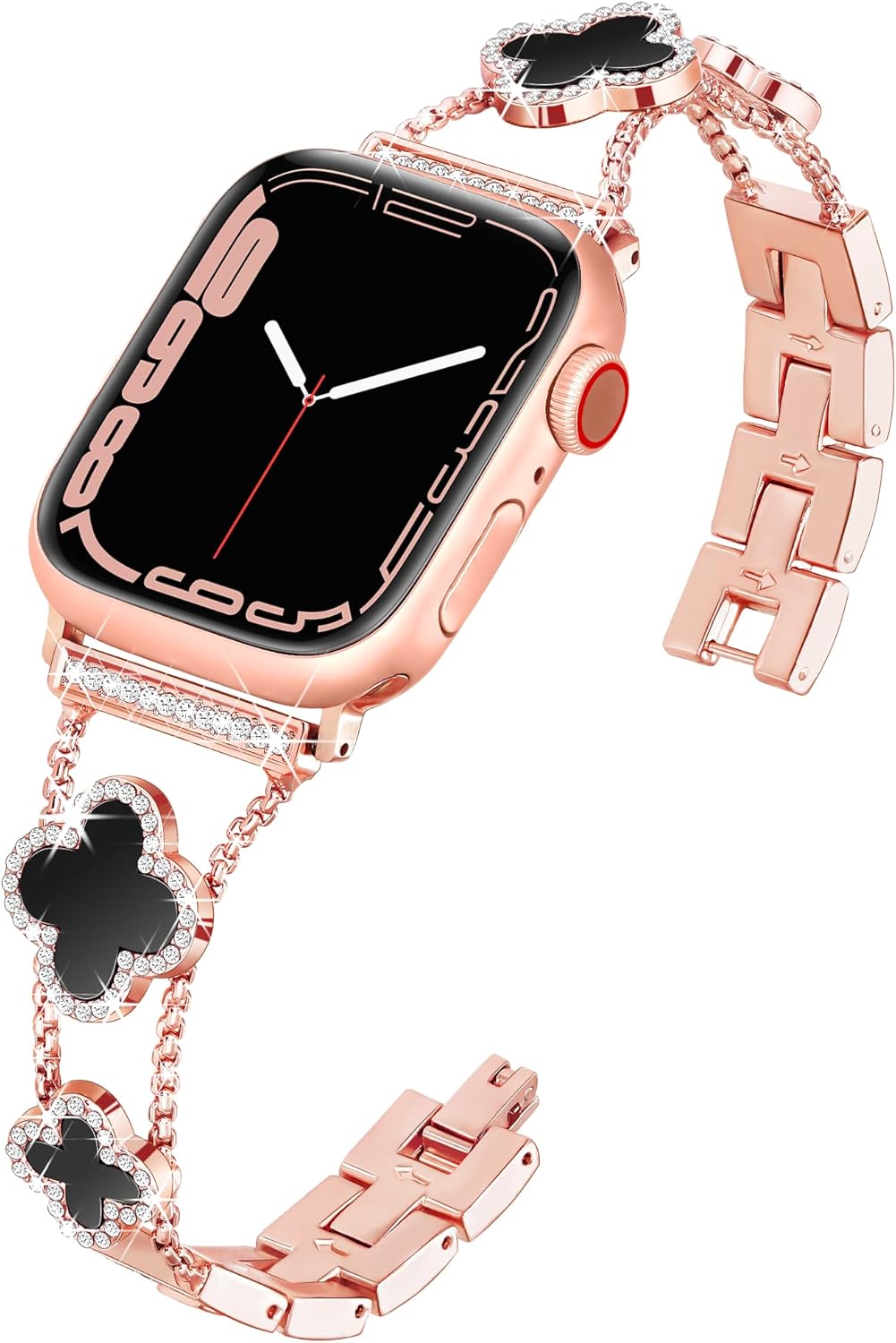 - 【Skillfully Designed Clover】This rose gold clover apple watch 10 band showcases a beautiful array of four-leaf clovers, symbolizing luck and love. Adorned with sparkling diamonds on each clover and link, it represents the strength and glow of women who stand out on their paths