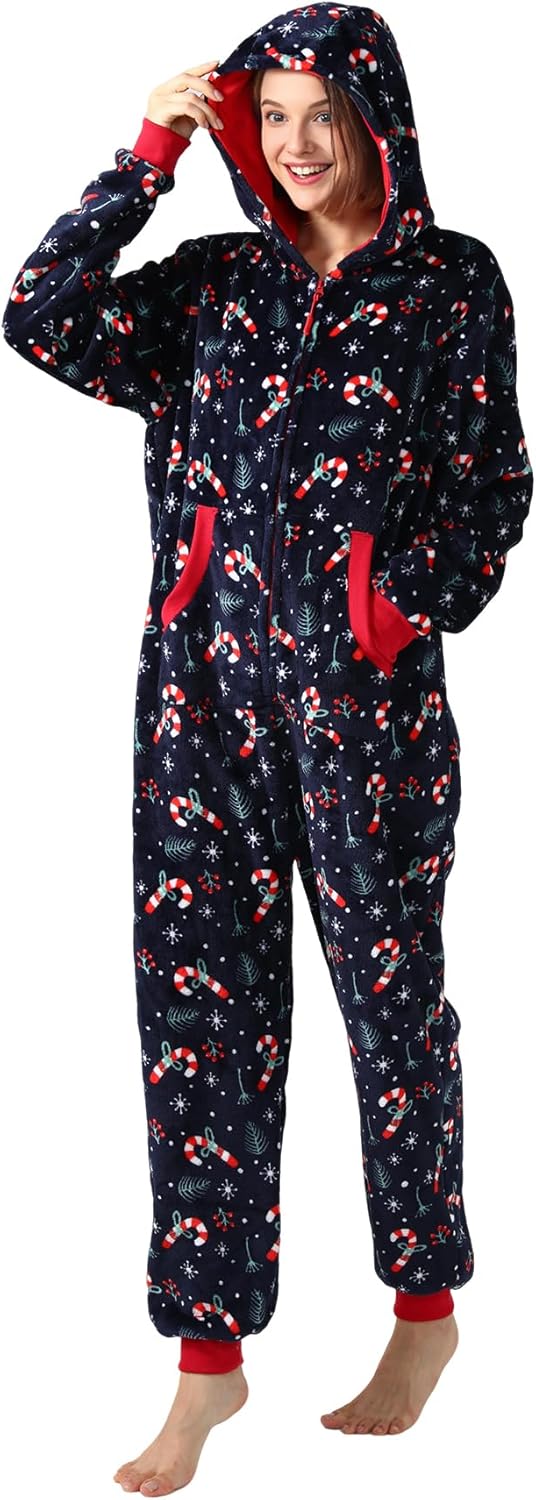 Unisex Christmas Onesie Pajamas Hooded Comfy Flannel Zipper One Piece Sleepwear Matching Jumpsuit for Family Couples