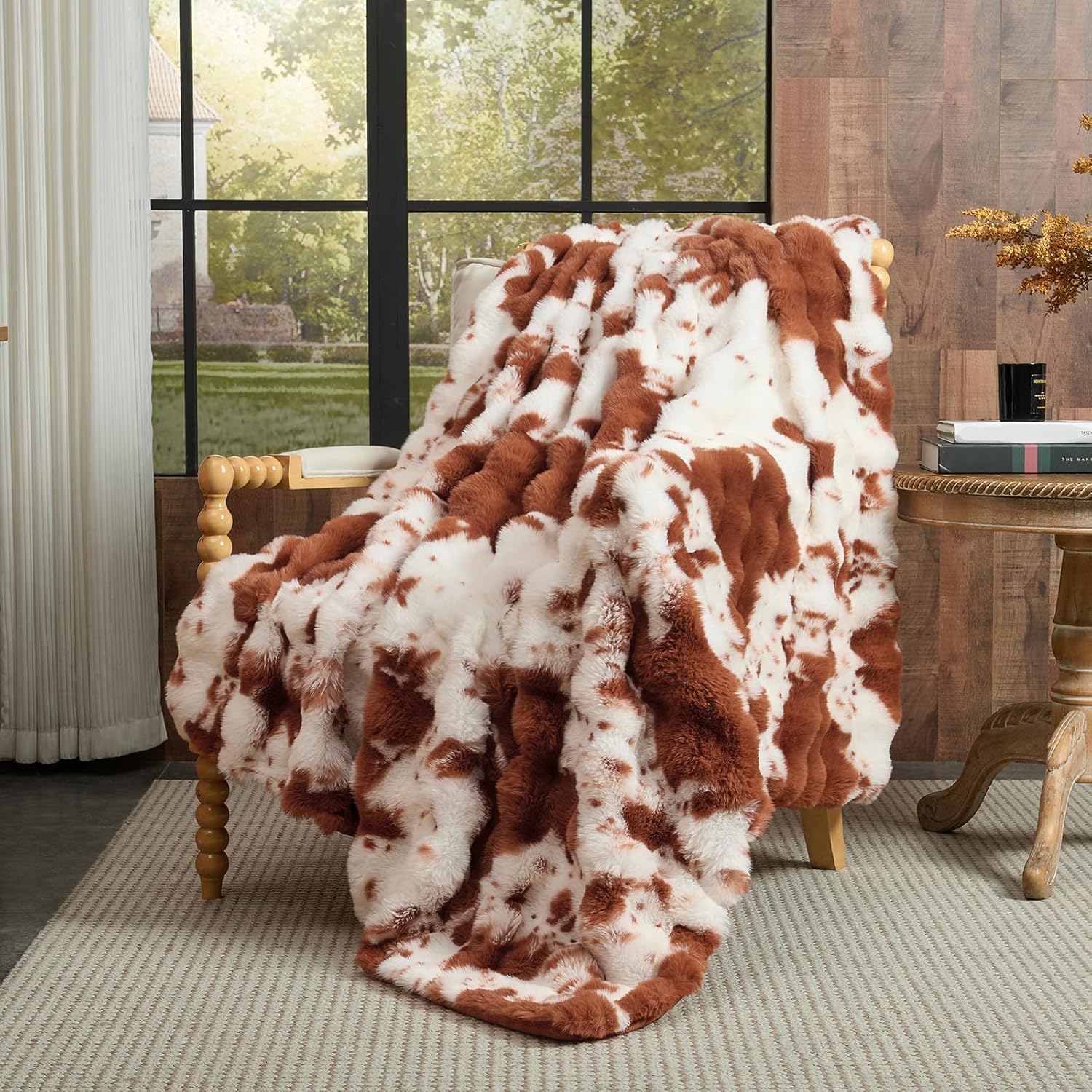Lotus Karen Faux Fur Throw Blanket Cow Print-Light Brown, Fluffy Fuzzy Plush Bubble Blanket for Couch, 90x90 InchesCozy Shaggy Rabbit Blanket, Luxury Decorative Gifts for Sofa Bedroom Living Room.