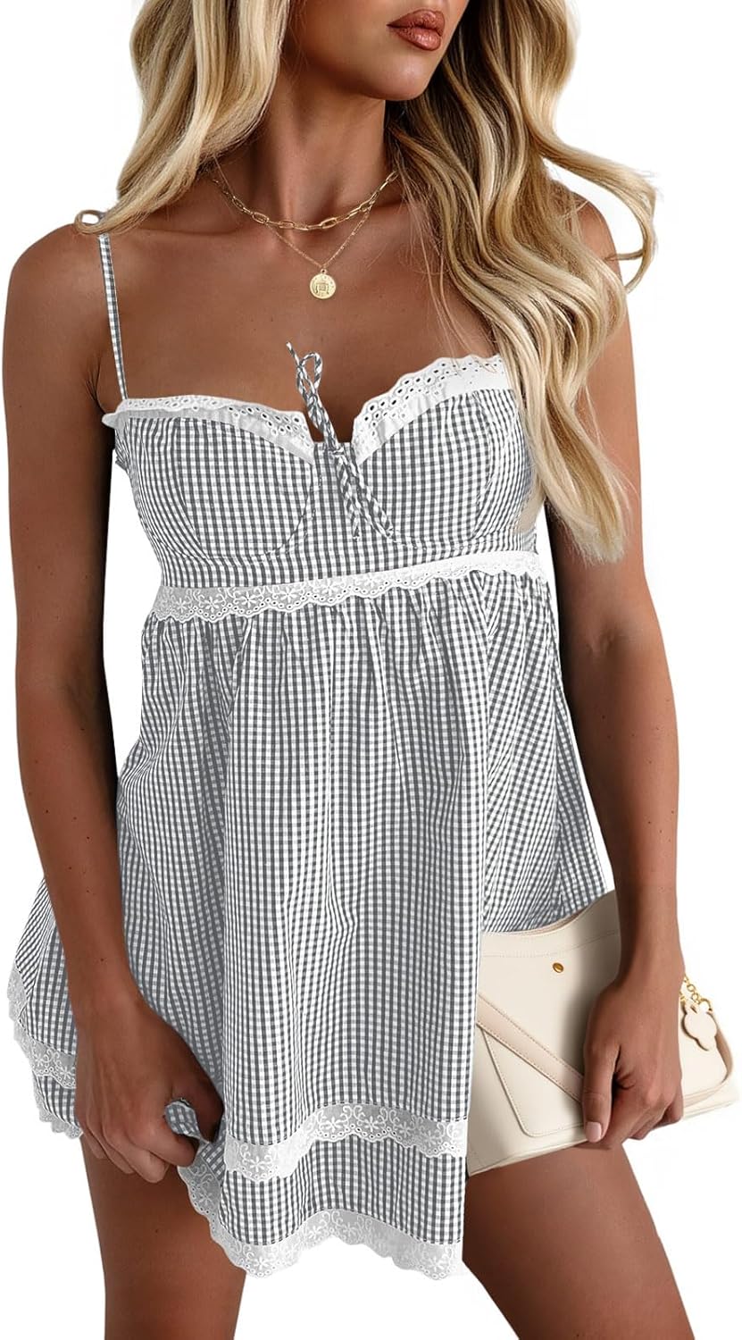 Wenrine Womens Summer Mini Dress Spaghetti Strap Sweetheart Y2K Plaid Lace Trim Tiered Beach Sundress Dresses Grey