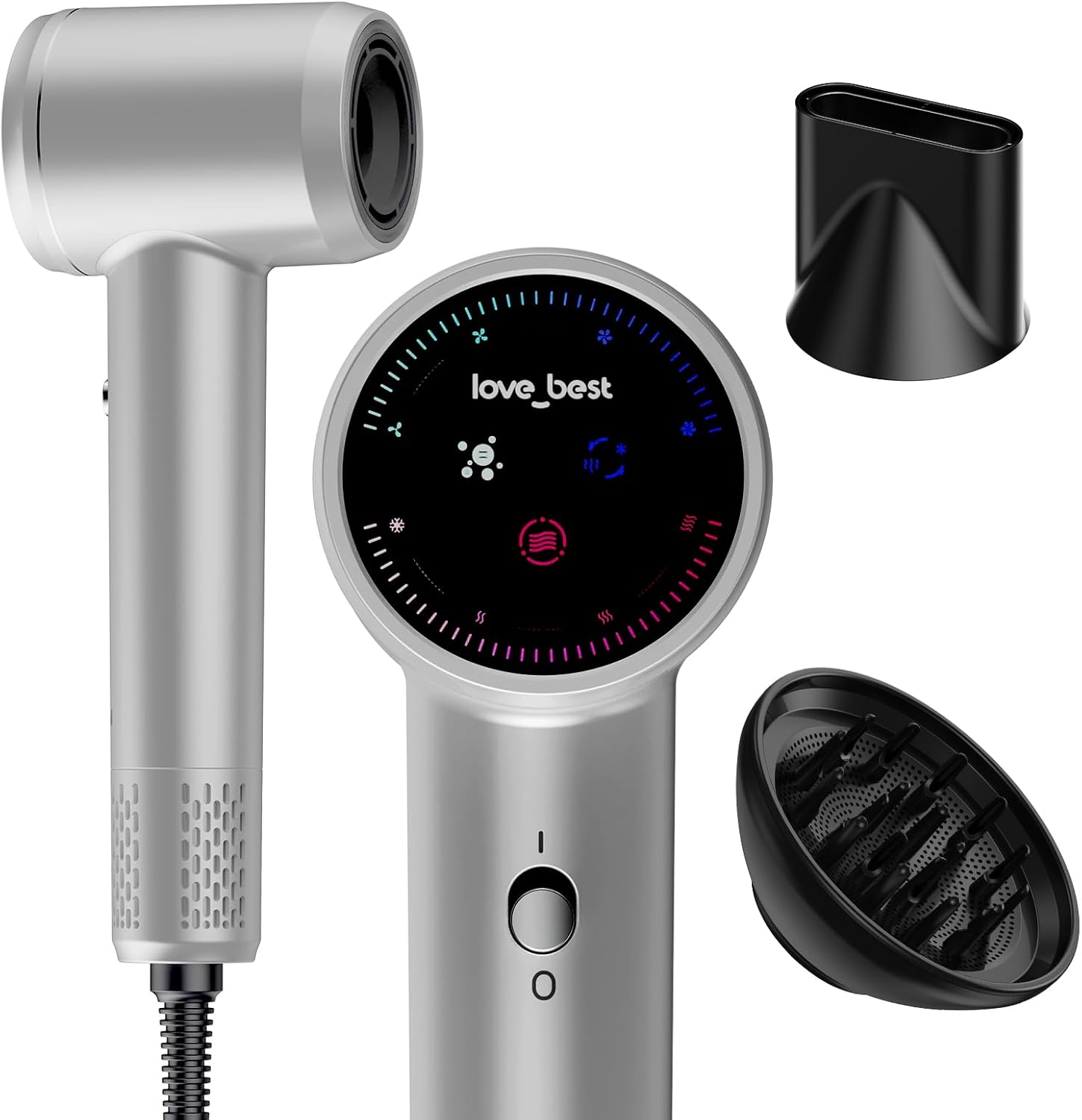 Hair Dryer, Dual-Ionic Hair Dryer with Diffuser, Professional High-Speed Lightweight Blow Dryer with Stepless Touchscreen Control, Low Noise for Home and Travel Sliver Gray