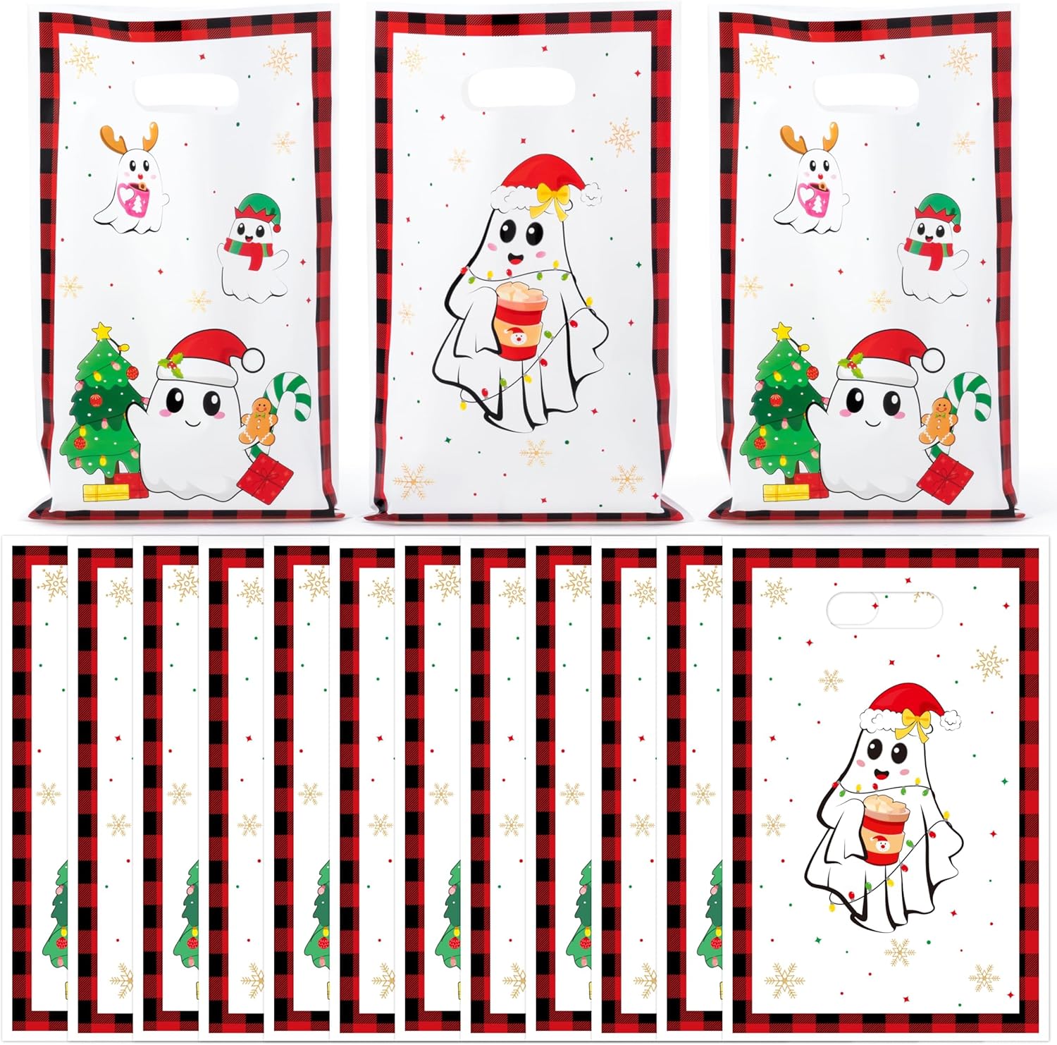 - Whimsical Ghost & Santa Fusion Design: Our goodie bags present friendly phantom characters blending Halloween fun with Christmas cheer in delightful winter scenes. The cute ghost designs feature happy expressions and classic Christmas elements that create a magical atmosphere. Made from quality plastic that's easy to carry and distribute, these lightweight bags add a touch of humor to your gift-giving occasions while appealing to guests of all ages.