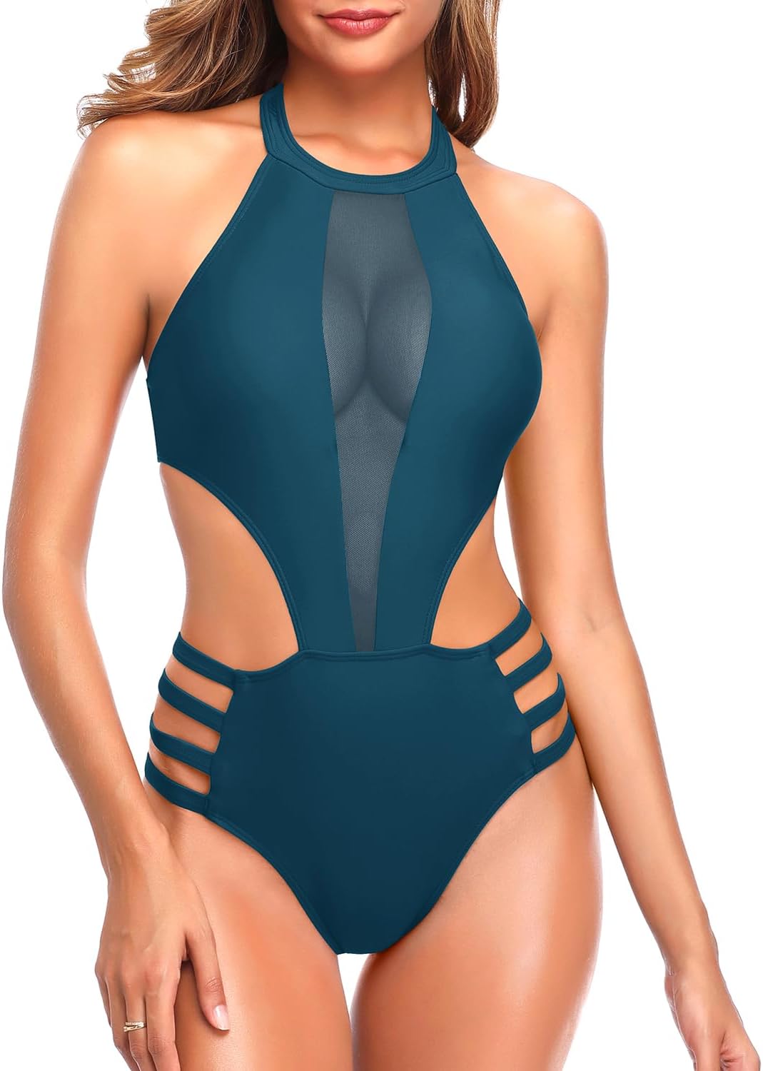 Tempt Me Women One Piece Sexy Mesh Swimsuit High Neck Halter Cutout Monokini Swimwear