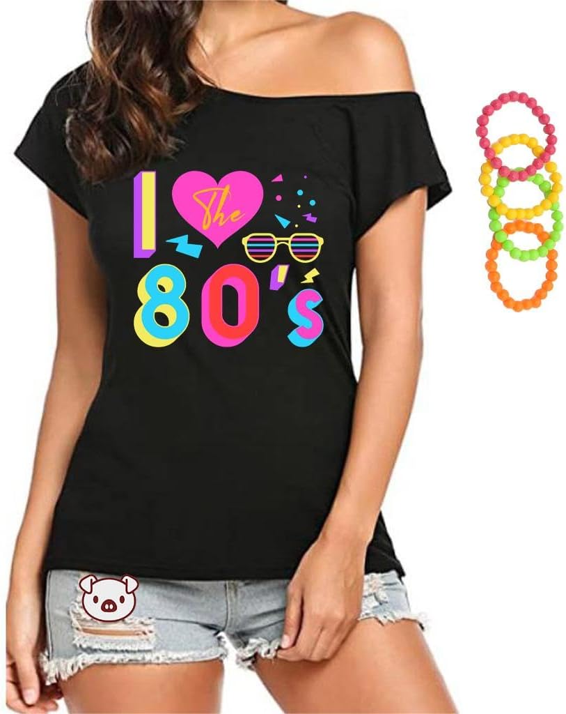 COLORFUL BLING 80s Shirts for Women I Love 80's Retro Off Shoulder Top Vintage 80s 90s Halloween Outfits with Accessories