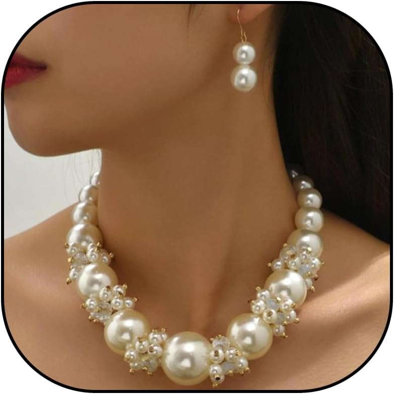 Dcfywl731 Pearl Necklace and Earring Set Pearls Jewlery Sets for Women Bridesmaid Jewelry Set Chunky Statement Big Large Pearls Choker Costume Jewelry for Women Wedding Jewelry for Brides