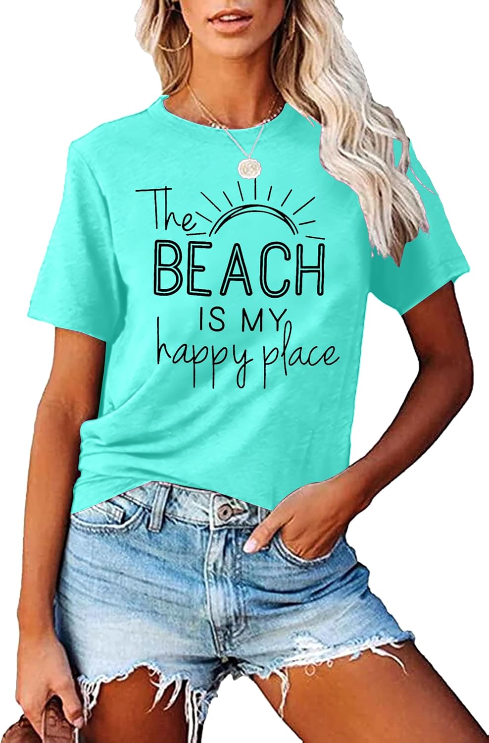 Beach Shirt Women The Beach is My Happy Place T Shirt Short Sleeve Casual Summer Vacation Tees Top