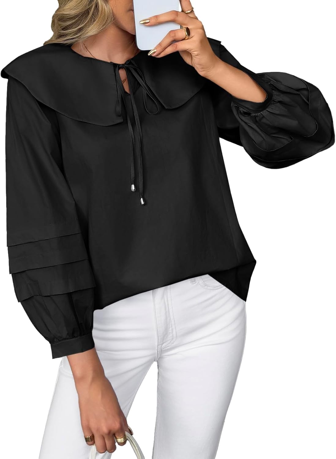 Cicy Bell Womens Peter Pan Collar Shirts Long Puff Sleeve Cotton Blouses Trendy Casual Loose Fit Tops