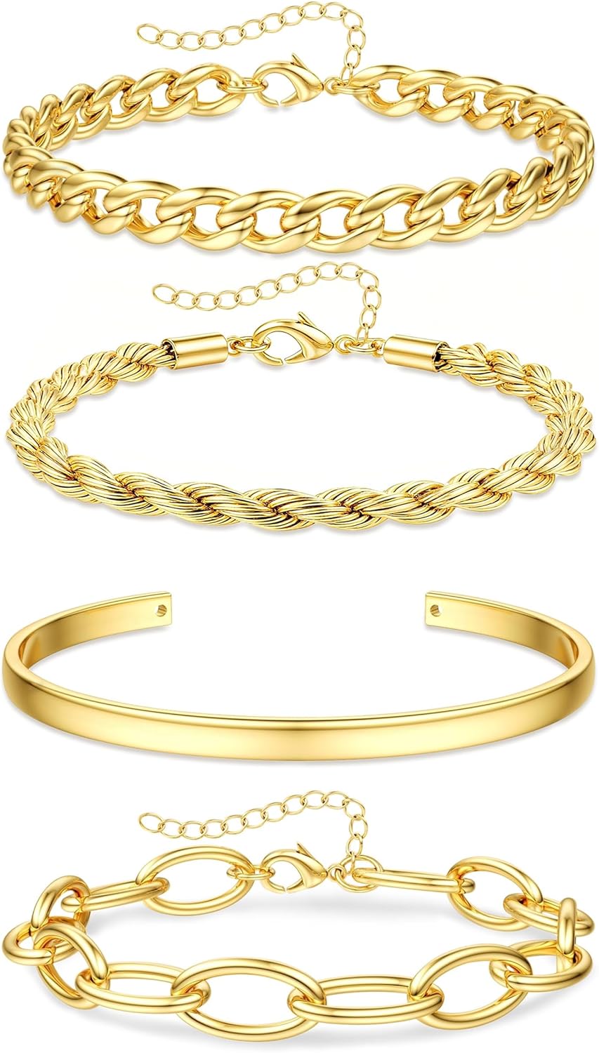Gold Chunky Stack Bracelets for Women Non Tarnish, 14K Gold Plated Bracelets Set for Women Stackable, Waterproof Layered Trendy Dainty Cuff Cuban Link Chain Paperclip Bracelet Pack for Jewelry Gifts