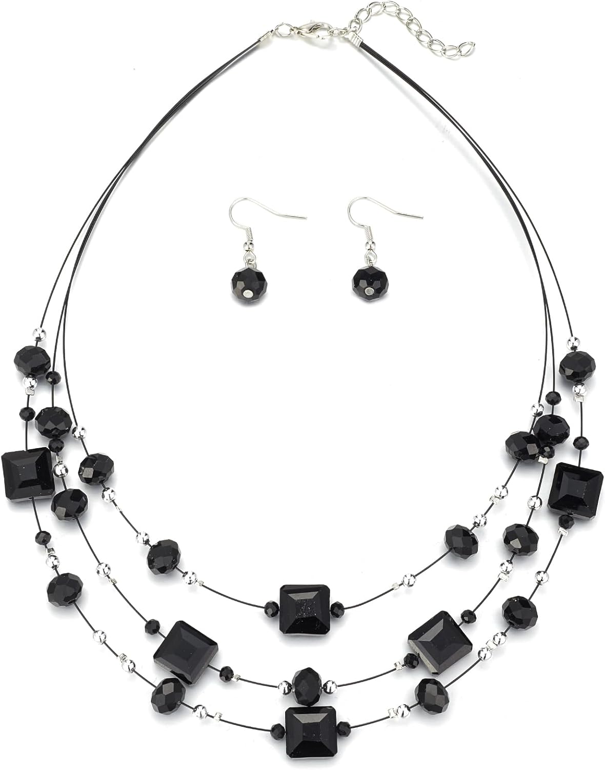 Layered Silver Beaded Necklace for Women Square Crystal Beads Statement Collar Necklace and Earrings Fashion Costumes Jewelry Sets for Women