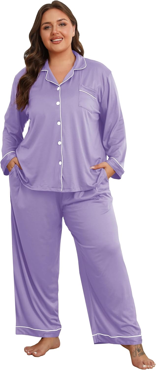 Vozanet Women's Plus Size Pajama Set Button Down Long Sleeve and Pants Lounge Sets with Drawstring and Pockets Sleepwear