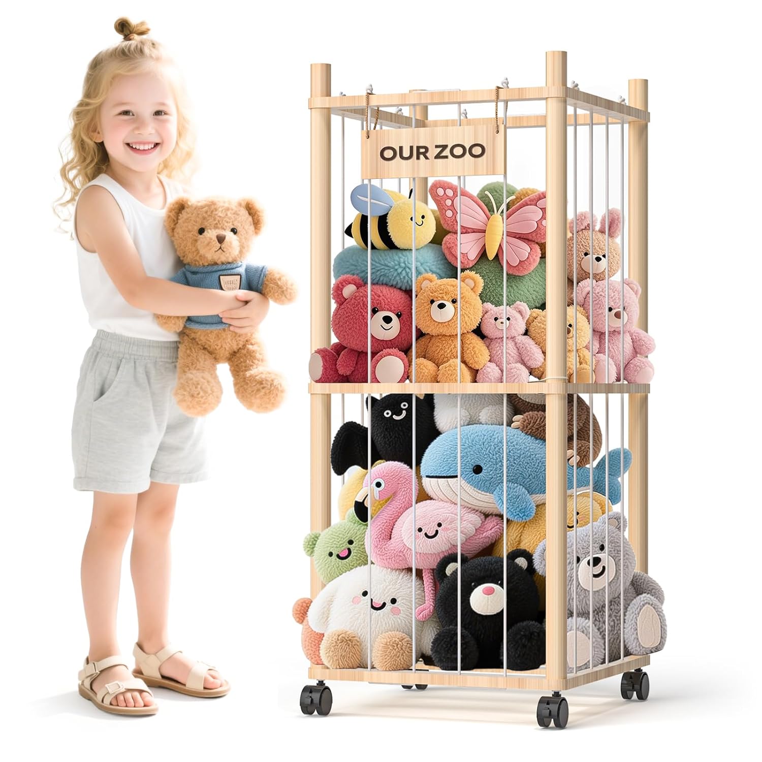 Stuffed Animal Storage: Wood Plush Toy Organizer, Stuffed Animal Zoo with Mesh Net, Stuffed Animal Holder with Brake Wheels, Space Save Stuffed Animal Cage for Kids Room Playroom Nursery Bedroom